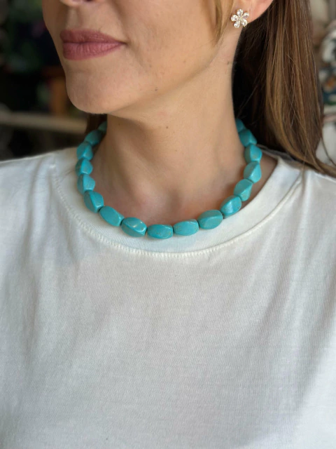 Destaques do Colar Curto Pedra Turquesa Grande: - Design curto que valoriza o pescoço com delicadeza - Pedra turquesa natural de alta qualidade, com acabamento único - Versatilidade para looks casuais e sofisticados - Conforto e durabilidade para uso diário